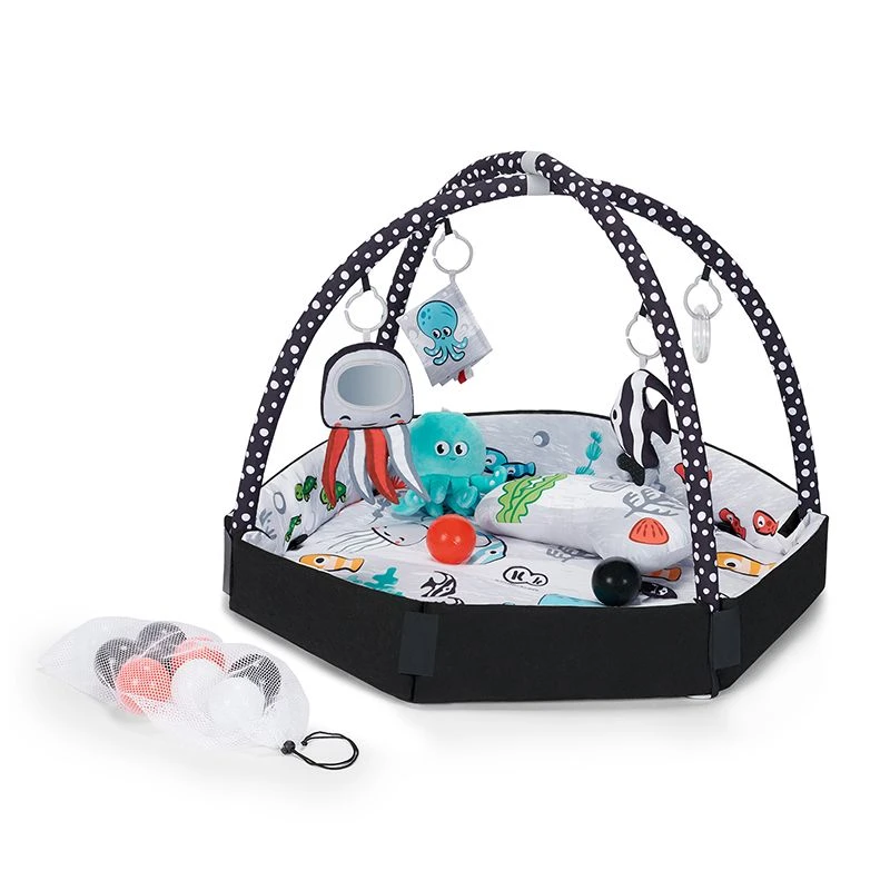 - 6 jouets qui stimulent les sens : un hochet, un anneau de dentition, une pieuvre en peluche, un poisson en peluche avec un anneau de dentition et organe sonore, un miroir poulpe avec des bras bruissants, un livre bruissant et 20 balles colorées